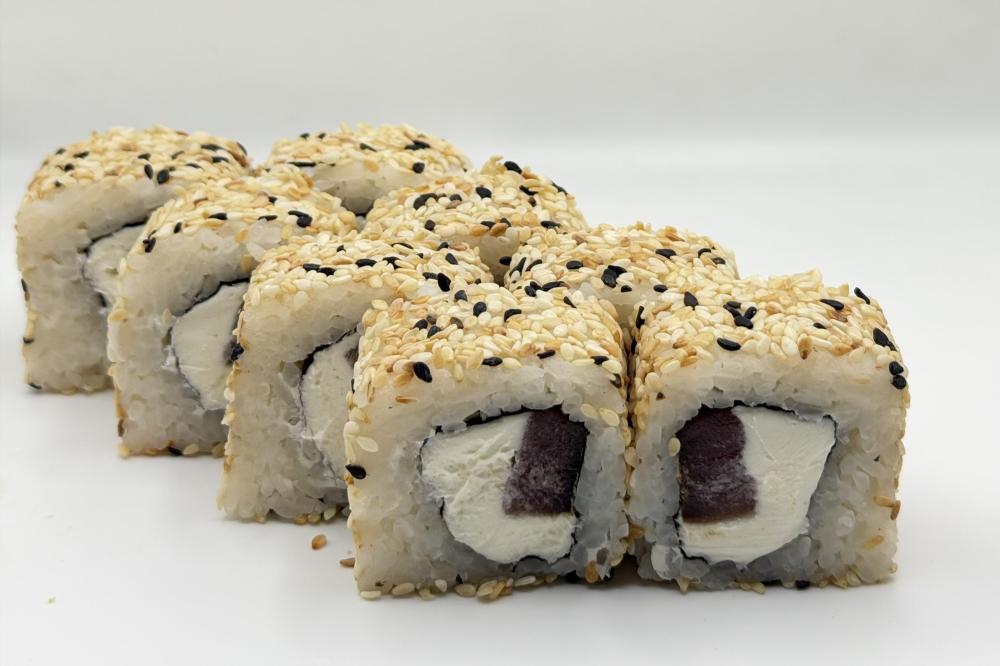 Сливочный сыр креметта, тунец маринованный в соевом соусе и зеленом луке, кунжут