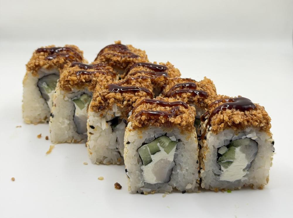 Сыр креметта, копченая рыба эсколар, огурец, лук Криспи, соус унаги, кунжут