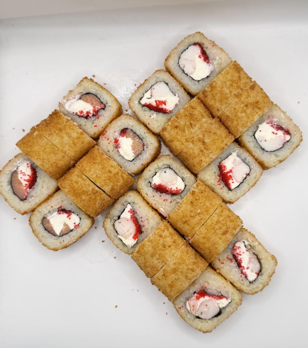 Теплый ролл панко с угрем 8 шт, маки с креветкой 8 шт, Филадельфия 8 шт, соус 2, имбирь 1, васаби 1, палочки 2