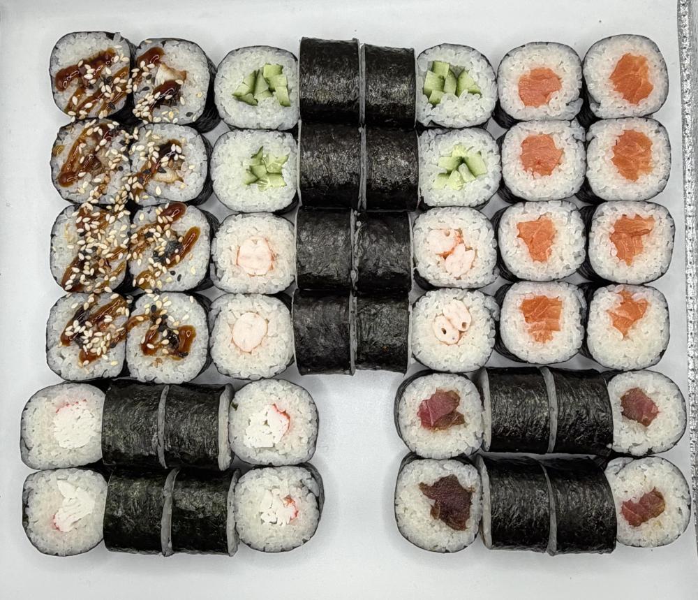 Маки с тунцом 8 шт, маки снежный краб 8 шт, маки унаги 8 шт, маки с огурцом 8 шт, маки с лососем 8 шт, маки с креветкой 8 шт, соевый соус 3 шт, имбирь 2 шт, васаби 2 шт, палочки 4 шт