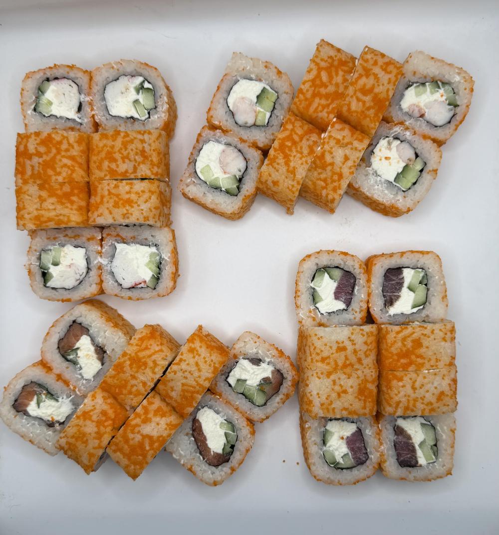 Калифорния с креветкой 8 шт ,Бостон 8 шт, 4 сыра 8 шт, Филадельфия 8 шт, цезарь с курицей 8 шт, не Оскар 8 шт , соус 3, имбирь 3, васаби 3, палочки 3